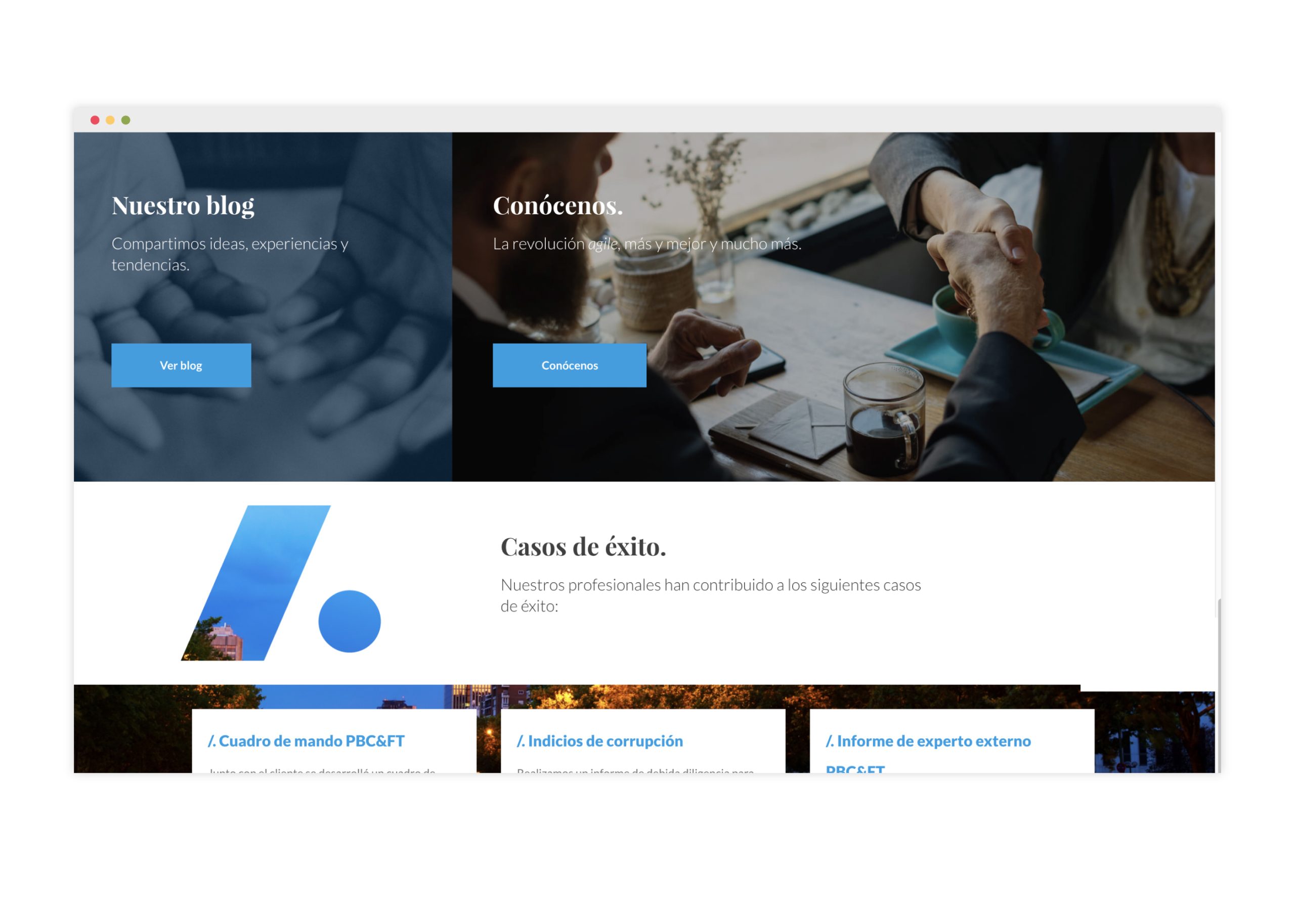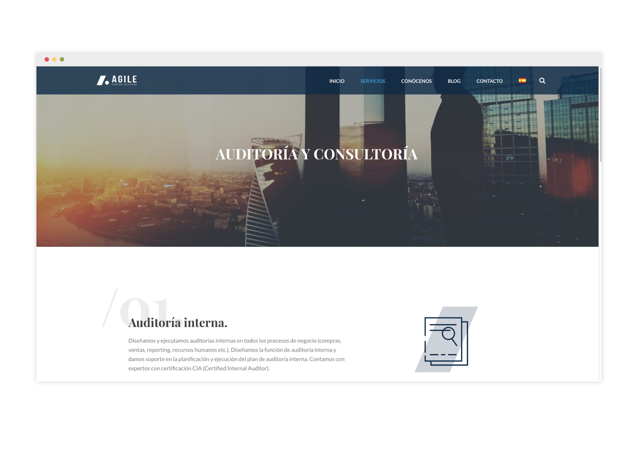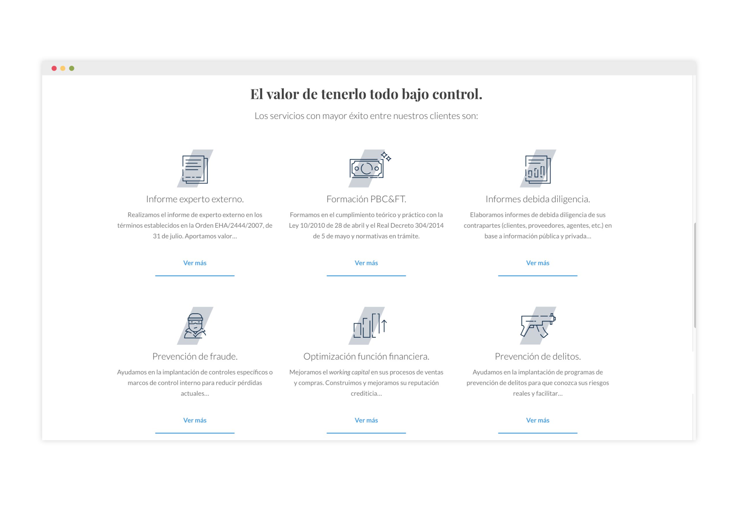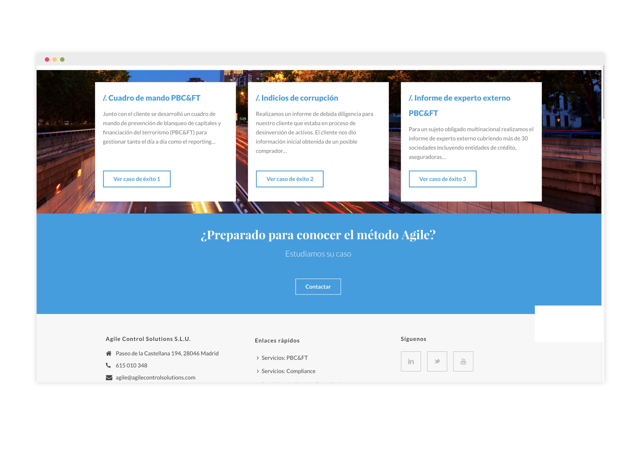 En este punto, nuestro objetivo, a la hora de plantear la estrategia de comunicación y diseño, era lograr un gran nivel de sobriedad, pero consiguiendo un aspecto visual de primer nivel, moderno y minimalista, que denotase la agilidad del servicio frente a su competencia más habitual, grandes consultoras con un dpto. de PCB&FT y mucha burocracia interna, que no cuentan con la especialización extrema de Agile Control Solutions.